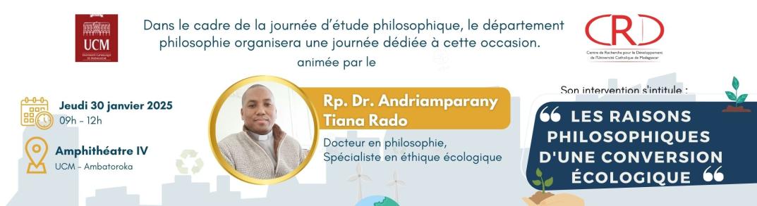 Cette rencontre sera animée par le RP Docteur Andriamparany Tiana Rado, Docteur en Philosophie de l'Institut Catholique de Paris (ICP) et spécialiste en éthique écologique. Il est actuellement le recteur du Grand Séminaire de Philosophie d'Antsirabe.